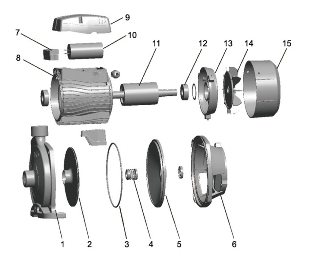 ● Статор (8) с обмоткой из меди и конденсатор (10) обеспечивают надёжную работу однофазных моделей.